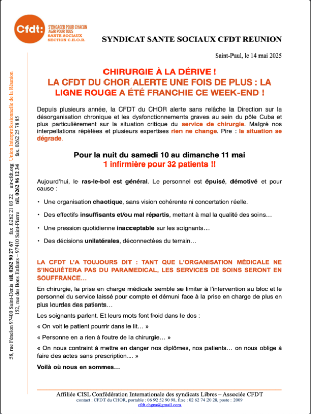 Depuis plusieurs année, la CFDT du CHOR alerte sans relâche la Direction sur la désorganisation chronique et les dysfonctionnements graves au sein du pôle Cuba et plus particulièrement sur la situation critique du service de chirurgie.