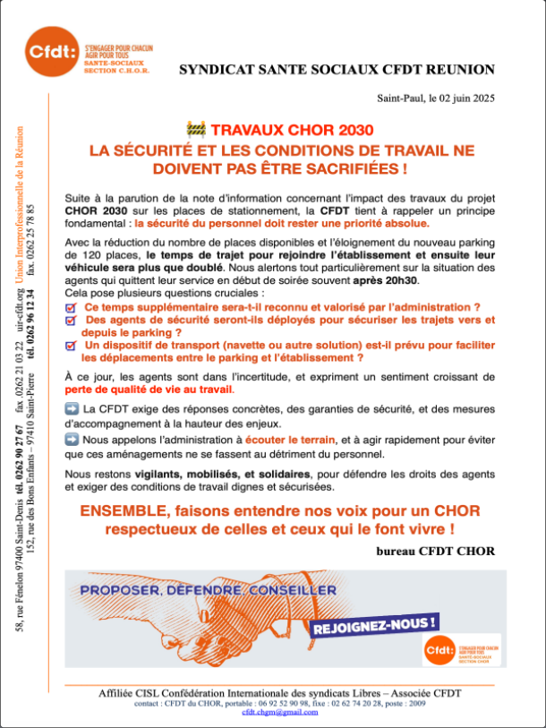 Suite à la parution de la note d’information concernant l’impact des travaux du projet CHOR 2030 sur les places de stationnement, la CFDT tient à rappeler un principe la sécurité du personnel doit rester une priorité absolue.